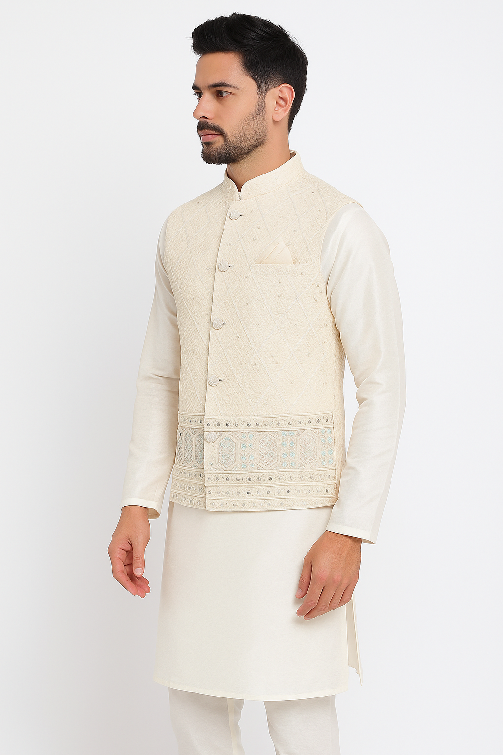 Lucknowi 3-Piece Vest coat Kurta Set in off-white